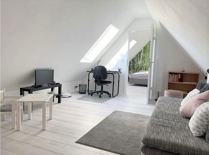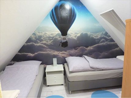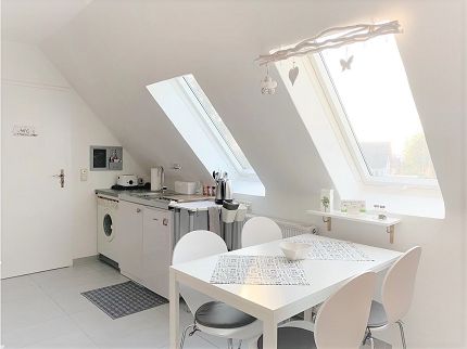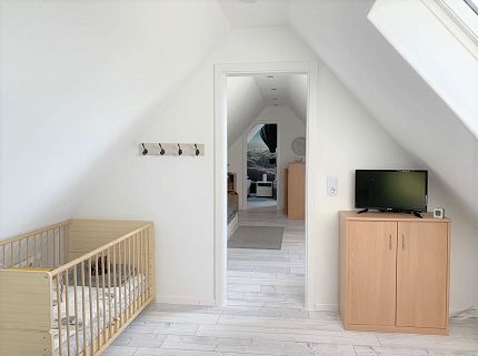Die helle, modern eingerichtete Ferienwohnung liegt im Dachgeschoß auf 2 Ebenen. Sie bietet Platz für 4 Personen + Kleinkind. Über die Wohnungsausstattung hinaus darf eine große Wiese mit Obstbäumen, die auch zum Naschen einladen und die mit Fußballtor, Trampolin, Wippe, Sandkasten und Tischgruppe mit 6 Stühlen ausgestattet ist, mit genutzt werden. Hier ist auch ein gemütlicher Grillabend möglich.