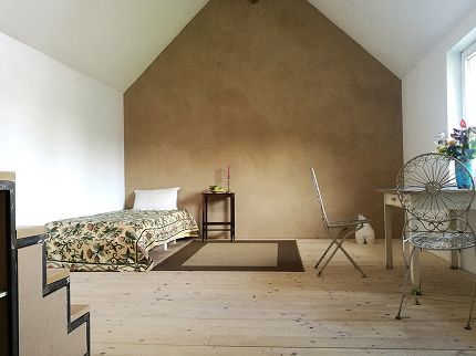 Der 28qm große Raum, mit 4m hohen Decken, ist mit einem komfortablen Hochbett für zwei Personen [mit Blick in den Himmel], einem Daybed zum Ruhen, Lesen oder Schlafen, einer Lehmwand, einem Holzofen, einem Bad mit Dusche und einer kleinen Küche ausgestattet. Hier gibt es WLAN, jedoch kein TV.